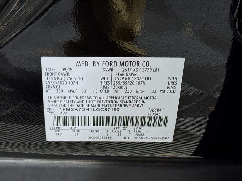 1st & 2nd Row Heated Seats, 20 Premium Painted Aluminum Wheels, 3.58 Non-Limited-Slip Rear Axle Ratio, 3rd row seats: bench, ActiveX Captain's Chairs, Auto High-beam Headlights, Comfort Package, Delay-off headlights, Equipment Group 202A, Exterior Parking Camera Rear, Front Bucket Seats, Fully automatic headlights, Heated Steering Wheel, Leather steering wheel, LED Fog Lamps, Power driver seat, Power Liftgate, Power passenger seat, Rear window defroster, Remote Start System, Steering wheel mounted audio controls, SYNC 3 Communications & Entertainment System, SYNC 3/Apple CarPlay/Android Auto, Unique Cloth Captain's Chairs.